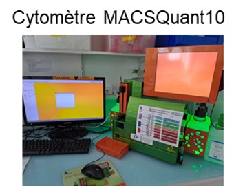 Le laboratoire est équipé d’un cytomètre MACSQuant10 (Miltenyi) possédant 3 lasers d’excitation (405 nm, 488 nm et 635 nm) et 8 canaux d’émission (V1 450/50, V2 525/50, B1 525/50, B2 585/40, B3 655-730, B4 750LP, R1 655/730, R2 750LP). Il est à la disposition des équipes de l’unité pour leurs analyses.